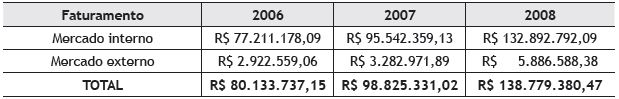 Com relação as informações da Tabela 2 é possível verificar o aumento de 72,12% no faturamento do mercado interno se comparamos o ano de 2006 com o ano de 2008; e um aumento notável de 101,42% no mercado externo no mesmo período. Fato que conforme mencionado por alguns gerentes de projeto, evidencia a difusão e/ou crescimento da comercialização dos produtos e serviços das empresas pesquisadas no mercado externo.