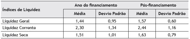 A seguir, os dados das análises de liquidez, endividamento e rentabilidade das MPEIs foram manuseados em uma perspectiva quantitativa para estabelecer a Média e o Desvio Padrão (DP) com o intuito de mensurar o reflexo do financiamento obtido pelas empresas nas Demonstrações Contábeis das mesmas. O DP foi utilizado para avaliar a dispersão do conjunto de valores na análise de liquidez. Barbetta (2001, p. 102-103) comenta que ao comparar os DPs de vários conjuntos de dados, “podemos avaliar quais se distribuem de forma mais (ou menos) dispersa. O desvio padrão será sempre não negativo e será tão maior quanto mais disperso forem os valores observados.” A Tabela 3 apresenta a análise de liquidez das MPEIs analisadas.