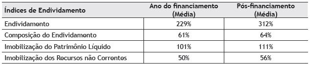 De acordo com a Tabela 4 percebe-se que, diferente da análise de liquidez, a análise da estrutura de capital média das MPEIs catarinenses beneficiadas pelo PJZ piorou no período do pós-financiamento em relação ao exercício da concessão do financiamento, uma vez que os índices de endividamento aumentaram no período. Tal fato pode ser explicado pela contabilização do financiamento do PJZ obtido pela empresa. Especificamente em relação ao índice de imobilização dos recursos não correntes, conforme Matarazzo (2007), este não deve em regra ser superior a 100% - como apontado na média das MPEIs pesquisadas - pois mesmo que a empresa tenha necessidade de ativo circulante, deve sempre existir um pequeno excesso de recursos não correntes, em relação às imobilizações, destinado ao ativo circulante.