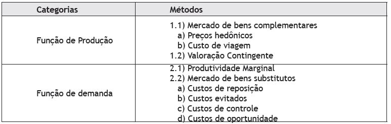 São destacadas duas categorias de métodos de valoração ambiental: métodos diretos (função de produção) e métodos indiretos (função de demanda).