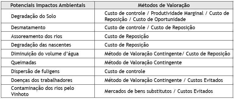 Com relação ao setor sucroalcooleiro percebe-se que nem todos os métodos são aplicáveis na valoração dos impactos ambientais do setor.