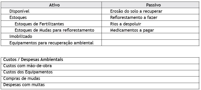 Após a valoração dos potenciais impactos ambientais, os mesmos poderiam ser evidenciados nas demonstrações financeiras mesmo que para fins internos. O modelo a seguir pode demonstrar como seria um balanço patrimonial adaptado ao setor sucroalcooleiro. Em seguida, são evidenciados alguns custos e despesas ambientais relativo ao setor.