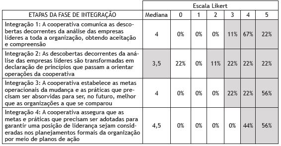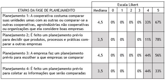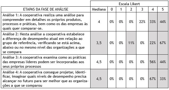 Quanto mais próxima a mediana obtida estiver do valor 5, máximo valor arbitrado para a escala, maior seria o grau de concordância em relação à presença daquela prática de gestão entre as cooperativas analisadas. Em seguida, outra análise foi feita, reunindo as questões em blocos que correspondem a todos os passos de uma determinada etapa do processo de benchmarking.