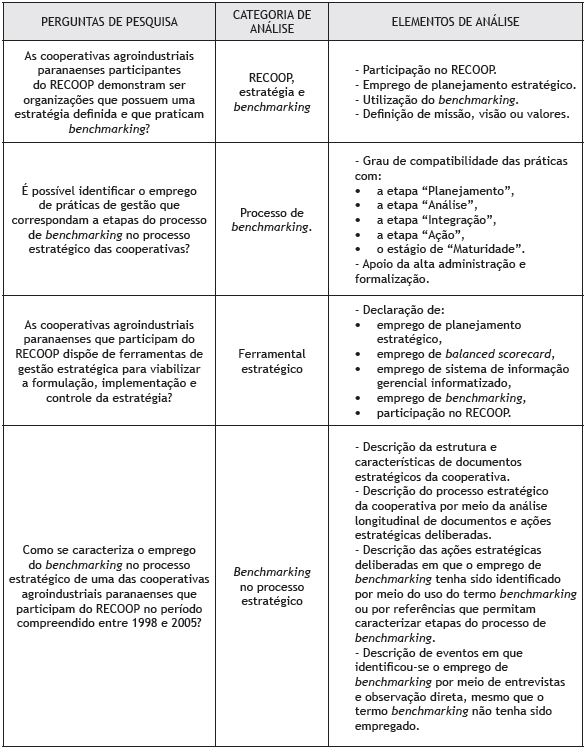 Por fim, o nível de análise é o organizacional, e que as unidades de análise são as cooperativas agroindustriais do Estado do Paraná que participam do RECOOP. A escolha destas cooperativas como unidade de análise foi baseada na suposição de que a implantação do RECOOP representou um estímulo importante para a adoção de modernas práticas de gestão pelas cooperativas agroindustriais, entre as quais, possivelmente, o benchmarking.