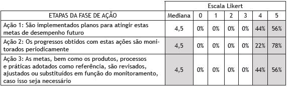 As três afirmativas criadas para medir as práticas de gestão convergentes com as etapas da fase de Ação apresentaram medianas elevadas, o que indica que poucos problemas poderiam surgir na implantação de um processo de benchmarking em relação a esta etapa. Em função deste resultado pode-se inferir que as cooperativas já adotam práticas de gestão estratégica mais convergentes com as que descrevem etapas da fase de ação do processo de benchmarking, o que facilitaria a implementação e a gestão do processo de benchmarking nestas organizações.