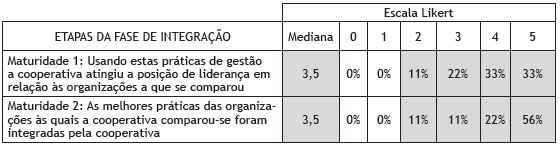 Com relação a esta fase verifica-se, que as cooperativas analisadas estão longe de possuir um ambiente que descreva a fase de maturidade em termos de benchmarking. Estas baixas medinas podem estar associadas a problemas de gestão nas etapas anteriores do processo de benchmarking, que fazem com que as cooperativas tenham dificuldade em atingir a etapa de Maturidade deste processo e pela falta de percepção a respeito do verdadeiro sentido do processo de benchmarking, que faz com que as cooperativas não atinjam uma posição de maturidade satisfatória neste processo.