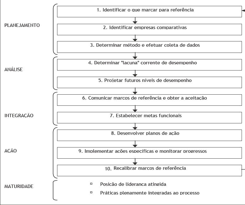 Para Camp (1998) o processo do benchmarking começa com o conhecimento sobre a própria empresa, baseada na avaliação de suas forças e fraquezas. Em seguida se faz a análise das forças e fraquezas dos concorrentes e líderes da indústria e se identificam quais padrões superiores devem ser seguidos, prossegue-se no processo incorporando as melhores práticas das empresas que se adotou como referência e, por fim, se estabelece um padrão de superioridade. O ciclo: conhecer sua operação, conhecer os líderes da indústria ou concorrentes, incorporar o melhor, conquistar a superioridade são descritos por Camp (1998, p. 2) como os “passos filosóficos básicos do benchmarking”. O processo pode ser detalhado em um esquema com dez etapas, ou passos, mostrados na Figura 1.
