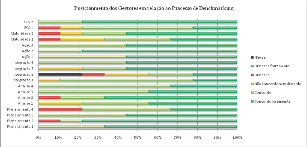 Para verificar em que medida práticas de gestão convergentes com os passos do processo de benchmarking estariam presentes no processo estratégico das cooperativas, os administradores estratégicos das cooperativas foram convidados a se posicionar em relação a uma série de afirmativas que descreviam as práticas de gestão compatíveis com o benchmarking. Os posicionamentos possíveis variavam ao longo de uma escala de 5 pontos: Discordo Fortemente (1), Discordo (2), Neutro (3), Concordo (4), Concordo Fortemente (5). Existe ainda a possibilidade de uma sexta resposta, que não compõe a escala, e que permite ao entrevistado não responder. “Não sei/Não quero responder (0)”.