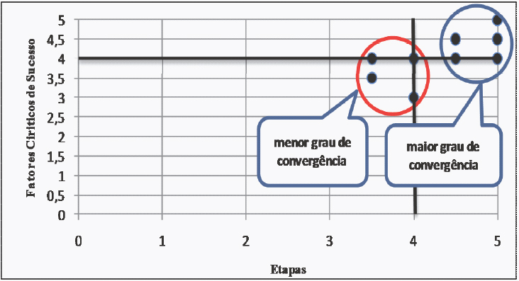 Por fim, para cada cooperativa foram elaboradas duas medianas, uma reunindo as médias dos posicionamentos para as 19 afirmativas relativas às etapas do processo de benchmarking e outra para as medianas das afirmativas relativas aos fatores críticos de sucesso do processo de benchmarking. Um gráfico foi então construído, o qual permite apresentar a posição de cada cooperativa em termos de sua posição relativa à convergência para o processo de benchmarking.