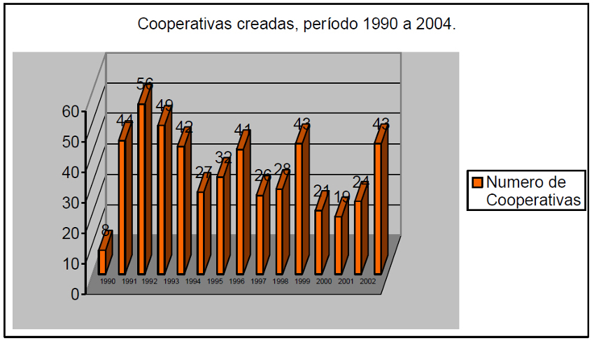 Desde el año 1990, y hasta el año 2004 (incluido), el Departamento de Cooperativas del Ministerio de Economía2, registra la creación de 503 nuevas cooperativas. Tal como es posible observar en el Gráfico N° 1, dentro de ese período es el año 1992, donde se alcanza el mayor número de cooperativas creadas, alcanzando a 56.