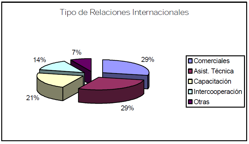 Al pedir caracterizar el tipo de realaciones con organizaciones extranjeras, éstas se concentran en el ámbito de la “asistencia técnica”, por una parte, y por la otra, en las relaciones de cáracter comercial. En ambos casos, con un 29 %. La distribución total, se puede ver en el siguiente gráfico: