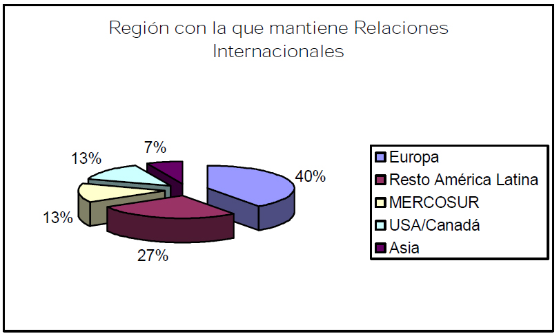 Respecto de las regiones del mundo, con las que se vinculan las cooperativas chilenas, los datos de la encuesta, indican la preeminencia de Europa, con un 40 % del total, luego el Resto de América Latina (países no pertenecientes a MERCOSUR), con un 27 % de los casos, mientras MERCOSUR “ampliado” (Argentina, Brasil, Paraguay, Uruguay + Bolivia, Colombia, Ecuador, Perú y Venezuela).