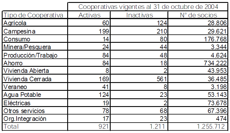 De acuerdo a estimaciones del propio Departamento de Cooperativas (2007 a), actualmente las cooperativas en Chile generan 36.679 puestos de trabajo. Por su parte, y tal como se muestra en el Cuadro N° 1, al 31 de Octubre de 2004, el número de socios/as de cooperativas en Chile alcanzó a 1.255.712.-, representando un 8,3 % de la población total del país, uno de los porcentajes más altos en la historia (Castillo et al.; 2006). Estas cifras, están directamente relacionadas con el explosivo aumento de miembros de cooperativas de ahorro y crédito, que en los últimos diez años han crecido en más de un 400 %, llegando hoy a representar casi un 60 % del total de chilenos/as asociados/as a cooperativas.3