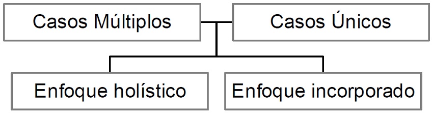 Segundo Robert Yin, há quatro tipos de Estudo de Caso possíveis: o caso único com enfoque holístico, o caso único com enfoque incorporado e os casos múltiplos com os mesmos enfoques, como podemos ver no diagrama abaixo: