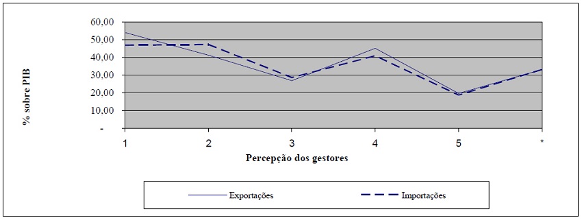 Como demonstrado no Gráfico 2, a curva que demonstra a percepção dos gestores com relação à exportação (% de exportação sobre o PIB) é semelhante à relação com a importação (% de importação sobre o PIB).