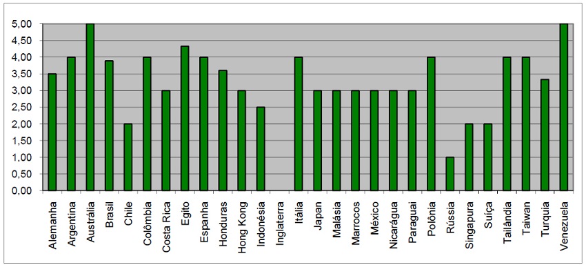 Adicionalmente, foi aplicado um questionário de cultura enviado à matriz e às subsidiárias. Este questionário foi proposto por Hofstede (2005) e contempla 26 questões. Os dados foram calculados, para cada país, de acordo com a metodologia proposta por Hofstede, e comparados com os dados da pesquisa do autor. Porém, o número restrito de respondentes por país, inerente à própria metodologia adotada, gerou resultados pouco consistentes. Optou-se, por isso, em descartar esses resultados da amostra e utilizar os indicadores obtidos nas pesquisas de Hofstede (1984, 1991).