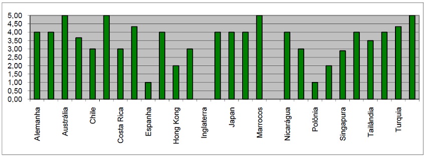 A seguir é demonstrada nos Gráficos 5 e 6 a percepção dos gestores das subsidiárias por país quanto ao critério de reconhecimento e mensuração de ativo diferido, respectivamente, na avaliação de desempenho: