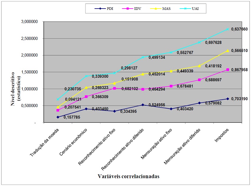 Por último, a análise dos valores culturais propostos por Hofstede não apresentou nenhuma relação com as variáveis de percepção dos gestores. Porém, pôde-se perceber que todos os valores culturais seguiram a mesma linha, mesmo não acompanhando qualquer relação com as variáveis. Dentre os casos analisados, a maior relação encontrada está entre os valores culturais e a conversão da moeda; a menor relação observada foi visualizada entre os valores culturais e os impostos.