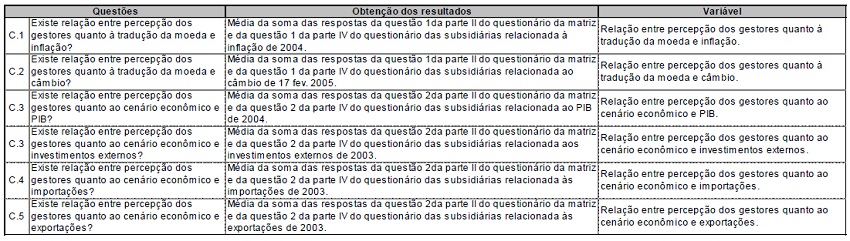 As percepções dos gestores - variáveis do Quadro 1 - foram confrontadas com alguns indicadores econômicos dos países onde estão localizados a matriz e as subsidiárias da amostra para verificar se há relação entre eles, como indica o Quadro 2.