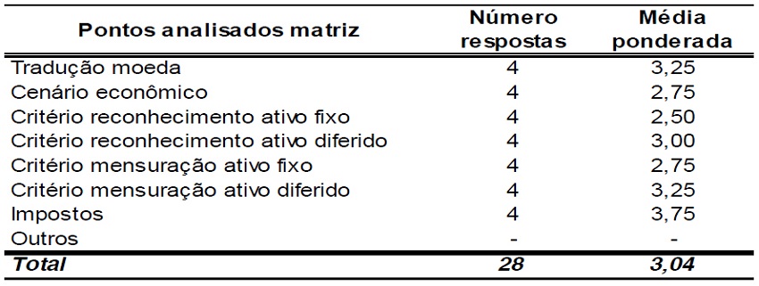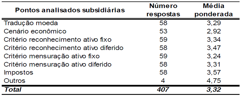 A Tabela 1 traz primeiramente a soma pura das respostas e, na seqüência, com base no número de respondentes que participaram do questionário a média ponderada de respostas. Nota-se que em nenhum dos itens pesquisados a matriz demonstra índice total de satisfação (média ponderada entre 1 e 2). O fator que menos apresenta dificuldades na opinião da matriz quando da análise de desempenho dos gestores das subsidiárias é o critério de reconhecimento do ativo fixo. Ao contrário disso, o item que mais apresenta peculiaridades e dificuldades na visão da matriz são os impostos. Essas dificuldades muito provavelmente resultam da especificidade de tratamento dado em cada país.