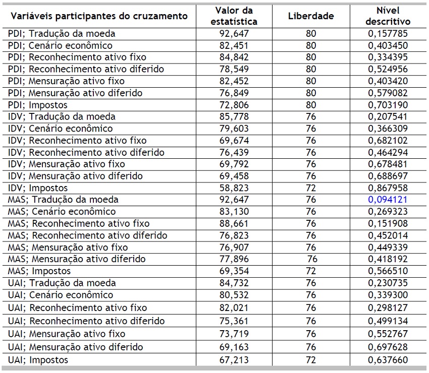 O Gráfico 8 a seguir evidencia os níveis descritivos de acordo com a análise. O valor cultural que mais se aproximou de uma relação foi a masculidade x feminilidade com a conversão da moeda, porém, mesmo assim, o nível descritivo ultrapassou 0,05, sendo 0,094.