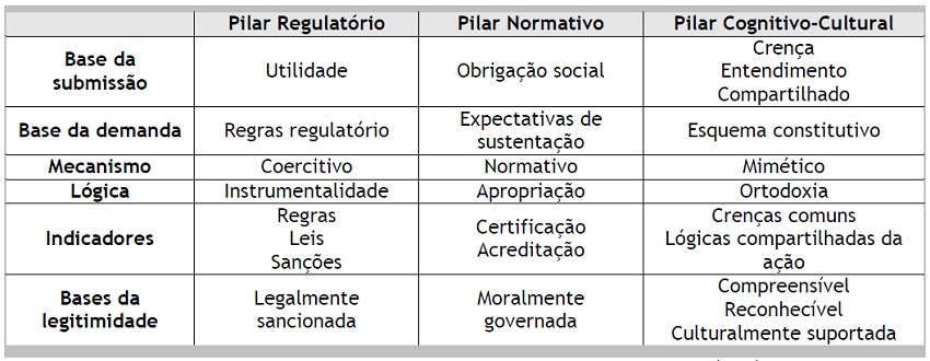 Scott (1995) desenvolveu um enfoque analítico para o que chamou de pilares que sustentam as instituições. Posteriormente, esse enfoque foi ampliado em Scott (2001) que incorporou os mecanismos de isomorfismo de DiMaggio e Powell (1983), conforme pode ser visto no Quadro 1, a seguir.