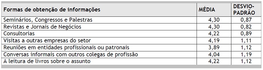 Dos dados dessa tabela, depreende-se a importância dos mecanismos normativos, destacando-se os seminários e palestras, e os casos relatados nas revistas e jornais de negócios. Também os livros, as consultorias e as visitas a outras empresas do setor mostram sua importância na obtenção da informação sobre novas práticas, confirmando a hipótese de socialização do conhecimento. Os seminários contribuem para a construção da base comum do conhecimento profissional, pois, geralmente, são desenvolvidos de forma a relatar casos de sucesso em empresas, com a participação dos próprios profissionais envolvidos no caso e, também, por profissionais de consultoria. Assim, é provável que os profissionais participantes de seminários sintam-se motivados a adotar as mesmas práticas relatadas por colegas de profissão. A mídia especializada tem um papel importante para atingir os objetivos de institucionalização, propagando o uso dos artefatos gerenciais para o grande público. Pode-se também citar o caso de representantes da mídia escolhidos para fazer o curso de avaliação de financiamentos de projetos de produção limpa (BENNETT et al., 2004).