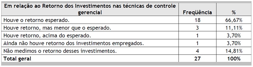 Por fim, foi formulada uma questão relacionada com o retorno sobre investimentos realizados para a implantação das novas práticas de controle gerencial e os resultados obtidos são apresentados na Tabela 10 a seguir.