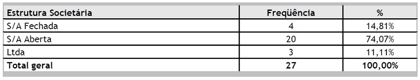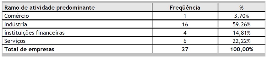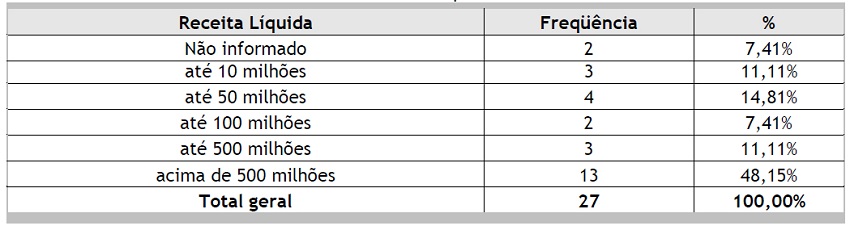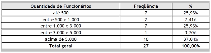 Quanto às empresas, observa-se a predominância de empresas de capital aberto, totalizando 20 empresas; em relação ao ramo de atuação, há uma concentração em indústrias, com 16 respondentes. Quanto ao porte, identifica-se que a maior parte das empresas é de grande porte, pois 18 empresas possuem mais de 1.000 funcionários, sendo que dessas, 10 possuem mais de 5.000 empregados. Outro fator que identifica o tamanho das empresas é a Receita Líquida Anual: 16 empresas têm uma Receita superior a 500 milhões de reais, conforme se pode observar nas Tabelas 1 a 4 a seguir: