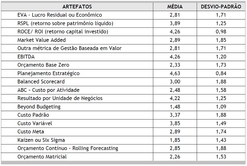 Já os artefatos mais contemporâneos da Gestão Baseada em Valor, como EVA e MVA, mostraram-se pouco utilizados, em contraposição aos artefatos mais tradicionais, como ROCE e ROI, que apresentaram uma utilização significativa. O Balanced Scorecard também se mostrou pouco utilizado pelos respondentes, o que contraria o argumento de Otley (1980), porém, dado que se trata de um artefato mais contemporâneo, pode-se entender que já está bastante institucionalizado. Esse resultado é coerente com pesquisas de Dietschi e Nascimento (2006).