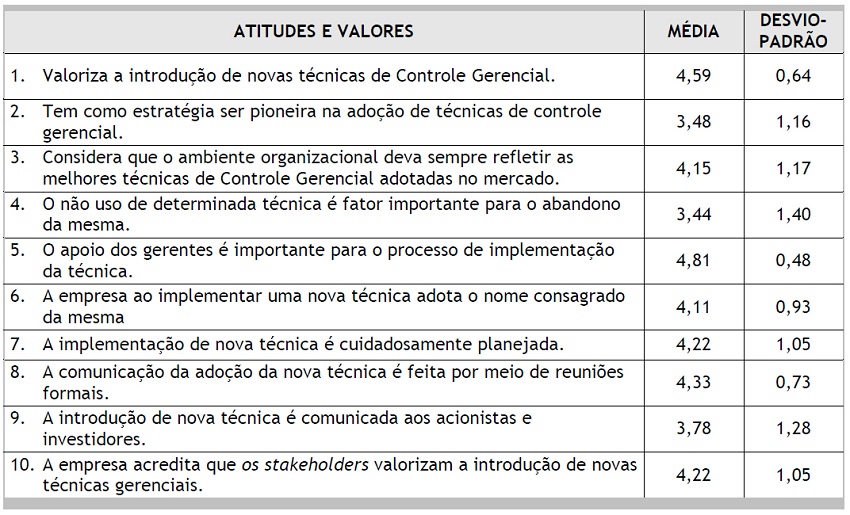 As respostas às questões 9 e 10, mostram que se leva em conta a percepção dos stakeholders, embora a comunicação das novas técnicas não seja direcionada aos acionistas e investidores. É, também, reconhecida a importância da adesão dos gerentes para facilitar a implementação do artefato consoante. Já na questão da desinstitucionalização, a menor concordância de que a não utilização implique no abando do artefato valida o aspecto da legitimação e confirma a visão de que adotar o artefato não significa necessariamente o seu uso.