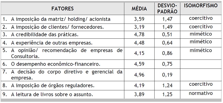 Os resultados obtidos indicam que o fator mais importante continua sendo a decisão do corpo diretivo e gerencial da empresa, mostrando que, de fato, há um processo de autonomia nessas organizações, uma vez que a imposição da matriz/acionistas se mostrou bem menor. Isso pode ser explicado pela crescente separação entre propriedade e administração nas empresas brasileiras de capital aberto. Por outro lado, nota-se como importante a imposição dos órgãos reguladores, uma vez que eles desempenham importante papel nas questões de contabilidade financeira e na sua divulgação ao mercado, o que pode gerar impactos nas práticas de contabilidade gerencial, já que a dissociação entre a contabilidade financeira e a gerencial é bastante tênue.