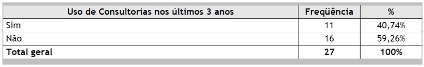 Formulou-se ainda uma questão especifica sobre a utilização dos serviços de Consultoria, especialmente por ser essa uma etapa considerada comum no procedimento de legitimação. Essa questão apresentou os seguintes resultados, sintetizados na Tabela 8 a seguir: