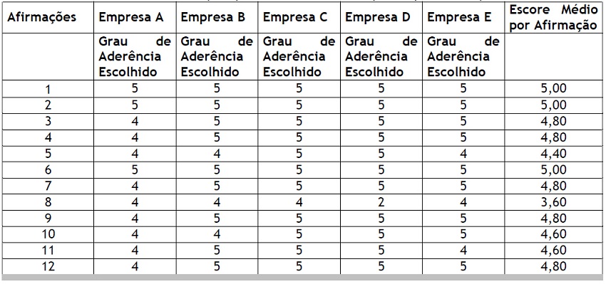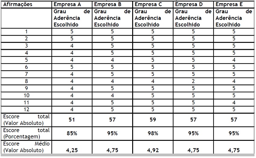 Na tabela 1 são apresentadas as respostas dadas a cada uma das afirmações do questionário pelas 5 (cinco) empresas, bem como os escores totais em valores absolutos e percentuais e o escore médio de cada uma das empresas.