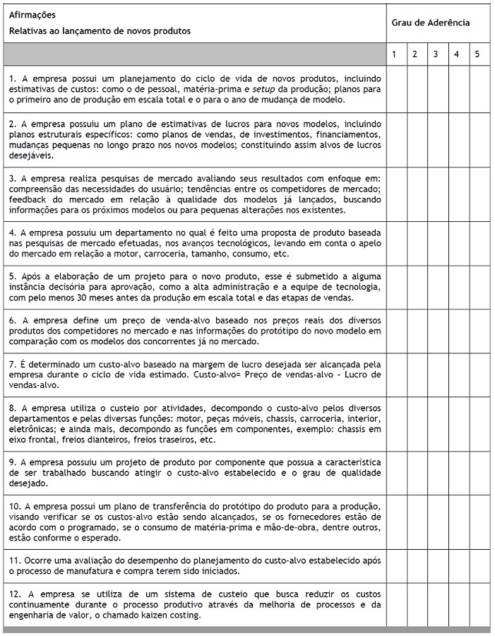 O questionário compreende três partes, primeiramente uma breve apresentação da pesquisa e do pesquisador, segundo um espaço para preenchimento dos dados do respondente e por último um quadro com 12 (doze) afirmações acerca do processo de lançamento de novos produtos. As afirmações foram formuladas com base nas 14 etapas apresentadas por Monden (1999, p. 29 à 35), que conforme o autor, são empregadas pelas indústrias automotivas na utilização do sistema de Custeio Alvo. As etapas são as descritas por Monden, de acordo com a seção 2.2, e o número entre parênteses designa a afirmação correspondente: