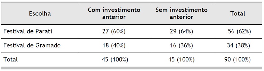 O resultado do cenário em que se fez a evidenciação dos valores já gastos apresentou que também a maioria dos respondentes (60%) escolheu o festival de Parati pelo mesmo motivo que os demais. Para este problema, observa-se que não ficou caracterizado um forte efeito do custo perdido, pois somente, aproximadamente, 40% dos respondentes escolheram o festival de Gramado em detrimento ao de Parati.