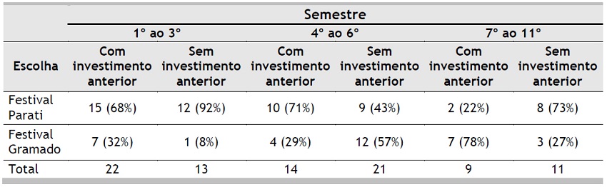 Já do 4º ao 6º semestre, o fato de não evidenciar o valor do investimento anterior fez com que os respondentes apresentassem o efeito do custo perdido, pois 57% dos participantes escolheram viajar para Gramado. Mas, com a evidenciação dos valores previamente investidos, o efeito do custo perdido não foi observado, uma vez que somente 29% dos respondentes escolheram o Festival de Gramado. Para um nível de significância de 0,01, o χ2 foi de 2,76, com valor crítico de 6,635. Isso significa afirmar que essas diferenças não são significativas.