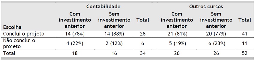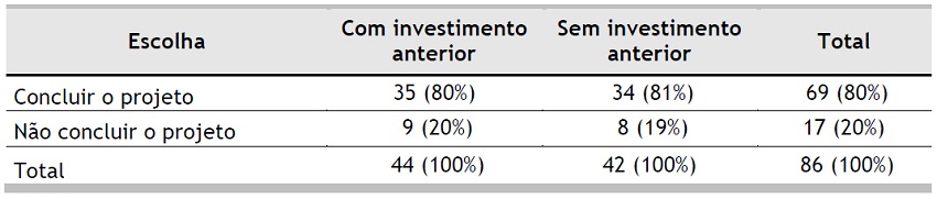 Com relação ao projeto de investimento (Tabela 6), os dados apresentam um forte efeito do custo perdido tanto para os contadores quanto para os não contadores. De forma análoga aos resultados anteriores, a variável curso não é significativa para o efeito do custo perdido, pois H0 não foi rejeitada (χ2 = 0,719, para nível de significância de 0,01).