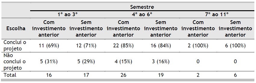 No contexto menos pessoal, no qual a decisão em questão é a de concluir ou não o projeto de um automóvel movido a óleo de mamona, em todas as classificações dos semestres, conforme tabela 4, o efeito do custo perdido foi observado, tanto para o cenário em que a informação do valor do investimento foi apresentada, quanto para o que tal informação não foi evidenciada. Para a primeira (1º ao 3º semestre) e segunda (4º ao 6º semestre) fases do curso, a classificação a hipótese nula não foi rejeitada para um nível de significância de 0,01, com χ2 =0,013 e 5,565. Logo, as variações percebidas são atribuídas ao acaso.
