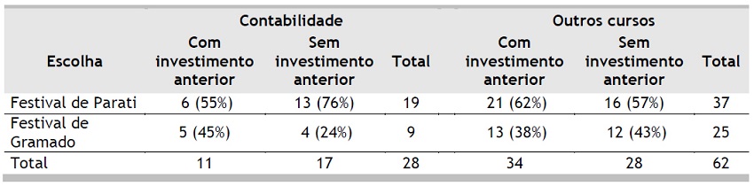 A Tabela 1 mostra as respostas dos alunos para o problema do festival (problema 1), no qual o estudo da existência ou não do efeito do custo perdido ocorreria numa situação de decisão pessoal. No problema, o respondente deveria escolher entre uma viagem a Gramado, uma vez que, foram gastos 1.000 reais com a compra da passagem, contra 500 reais gastos para ir à Parati. Com relação aos dados apresentados na tabela, observa-se que 64% dos respondentes ao cenário no qual não foram apresentados os valores gastos, escolheram ir ao festival de Parati por haver uma expectativa de que a viagem seja a mais divertida dentre as opções.