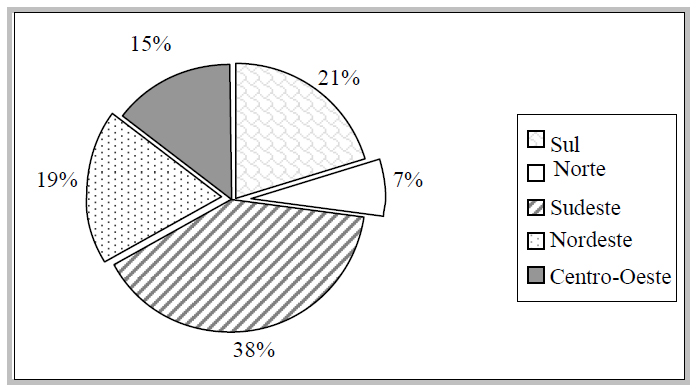 O Gráfico 1 representa o percentual de cursos de graduação em Ciências Contábeis nas regiões do Brasil. Observa-se que a região Sudeste, com 38% dos cursos nas capitais dos seus estados, possui a maior quantidade de cursos de graduação. Apenas 7%, do total de 888 instituições, estão localizadas na região Norte.