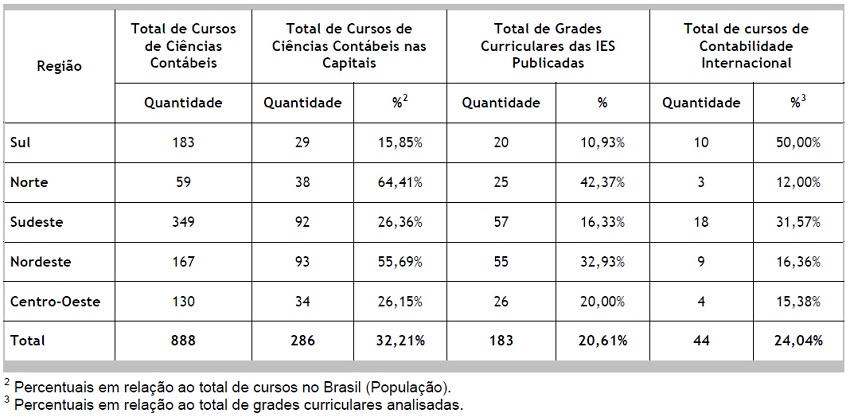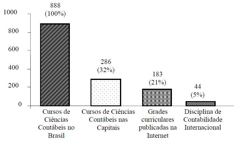Nesta pesquisa observou-se que das 888 instituições existentes no Brasil, 286 (32,20%) encontram-se nas capitais dos estados brasileiros e, destas, 183 (20,61%) publicaram suas grades curriculares na Internet. Porém, em apenas 44 (24,04%) grades curriculares foi encontrada disciplina Contabilidade Internacional, ou similar.