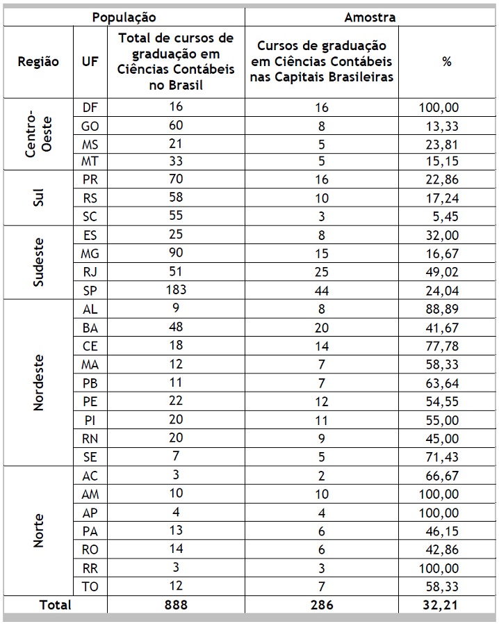 A Tabela 1 apresenta o perfil da amostra com a relação de cursos de graduação em Ciências Contábeis das Instituições de Ensino Superior nas cinco regiões brasileiras: Sul, Sudeste, Norte, Nordeste e Centro-Oeste. Do total de cursos, 286 são ofertados nas capitais, representando 32,21% do total de cursos oferecidos no Brasil. A amostra representa todos os cursos de Ciências Contábeis das capitais dos estados brasileiros.