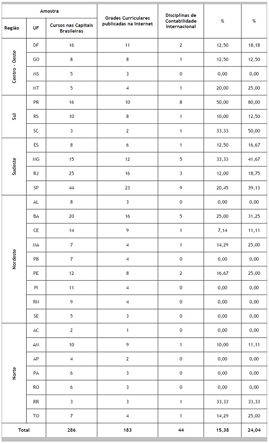 Outra observação importante são os casos de Roraima, do Distrito Federal e do Amazonas, onde 100% das Instituições foram verificadas, e apenas 33,33%, 12,50% e 10% respectivamente, possuem a disciplina de Contabilidade Internacional ou similar. Os estados de Mato Grosso do Sul, Alagoas, Paraíba, Piauí, Rio Grande do Norte, Sergipe, Amapá, Pará e Rondônia não apresentaram a disciplina nas IES verificadas.