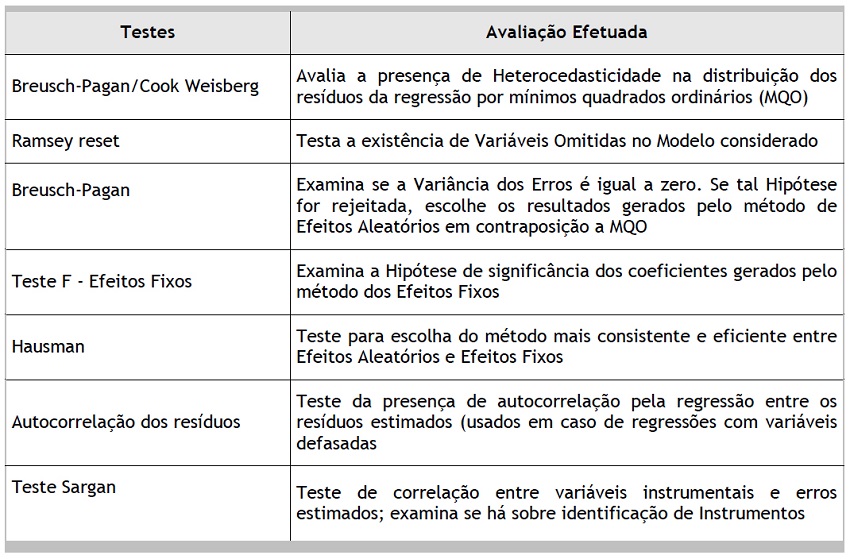 Ademais, foi testada a influência de variáveis não observáveis, seja por efeitos fixos, seja por efeitos aleatórios, usando-se para a análise final a relação estatística mais adequada.