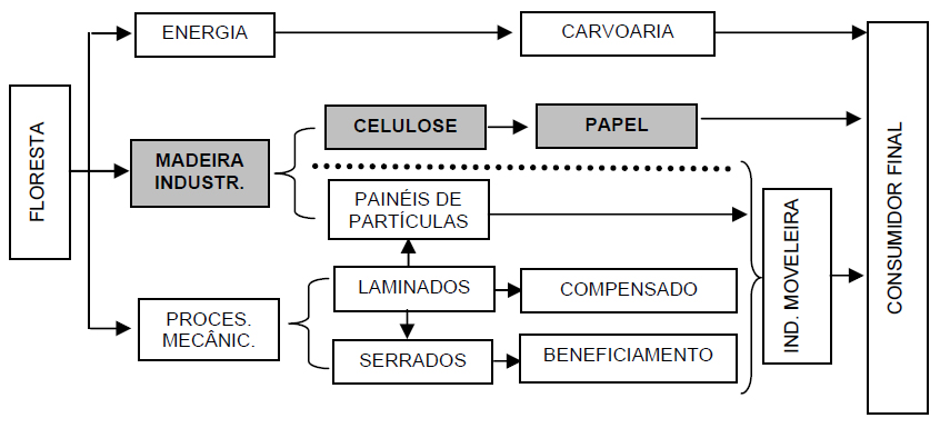 A cadeia produtiva do setor florestal é composta por três segmentos básicos: (1) madeira para energia (lenha e carvão); (2) madeira industrial (celulose e papel; painéis de madeira reconstituída); (3) processamento mecânico (serrados e laminados), conforme demonstrado na Figura 1. Acrescenta-se que este trabalho está direcionado a analisar a colheita de florestas que abastecem as indústrias do segmento de madeira industrial, subsegmento celulose e papel.
