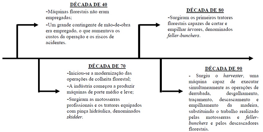 De acordo como Parise (2005) o processo produtivo das empresas que realizam serviços de colheita florestal no Brasil tem sofrido alterações significativas nos últimos anos, evoluindo da colheita manual e semimecanizada para a mecanizada. A evolução da colheita florestal no país pode ser dividida em quatro fases distintas, conforme apresentado na Figura 2.