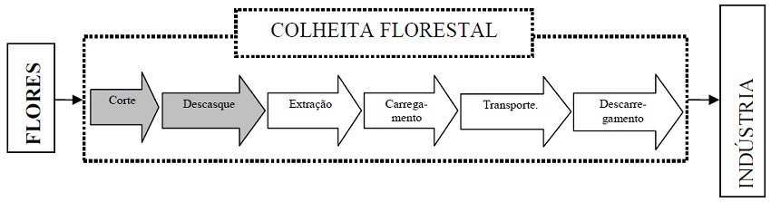 Malinovski e Malinovski (1998) definem a colheita florestal como uma cadeia produtiva formada por etapas denominadas atividades parciais, as quais englobam desde a derrubada das árvores até a colocação da madeira no pátio da indústria consumidora. De modo geral, o sistema de colheita de madeira abrange as seguintes atividades: (1) corte: compreende as operações de derrubada, desgalhamento, traçamento das árvores em toras ou toretes e empilhamento da madeira; (2) descasque: objetiva separar a casca do tronco, em razão das necessidades do produto final e, por isso, é uma atividade opcional; (3) extração: fase relacionada ao transporte da madeira do local de corte até a beira da estrada, carreador ou pátio intermediário, de onde é transferida para os veículos que fazem o transporte final até as fontes consumidoras; (4) carregamento: representa a colocação da madeira extraída nos veículos que a transportam até o local de utilização final ou pátios especiais; (5) transporte às fontes consumidoras: consiste no transporte da madeira coletada da floresta até o centro de consumo; (7) descarregamento: última etapa da cadeia de produção; corresponde à retirada da madeira do veículo de transporte e sua colocação no pátio da empresa consumidora (Figura 3).