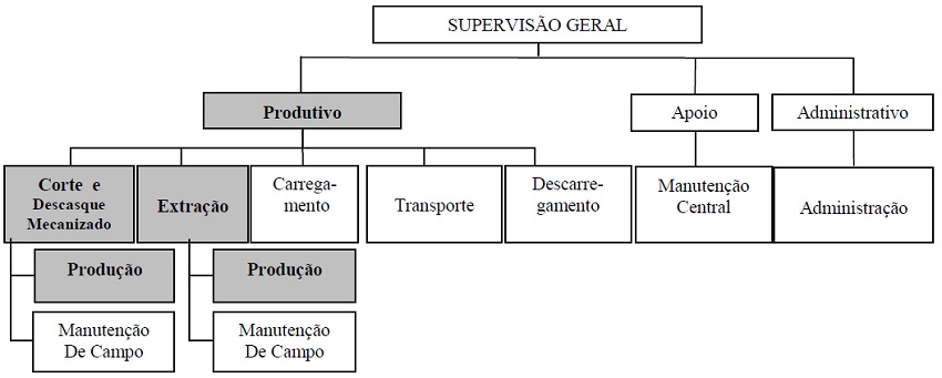 A Figura 3 permite identificar os departamentos que no conjunto formam a empresa, a saber: (1) departamento produtivo: que compreende todas as etapas da colheita florestal; (2) departamento de apoio: composto por (a) departamento de manutenção de campo, que presta serviços especificamente para cada um dos departamentos produtivos e (b) departamento de manutenção central, que atende a todos os setores e que se localiza na cidade e (3) departamento administrativo: encarregado das atividades administrativas e comerciais da empresa. Os impactos ambientais são monitorados pela contratante, proprietária das florestas, certificada pela respectiva norma ISO e por órgãos governamentais específicos do setor florestal. A contratada, embora deva atender as normas de qualidade estabelecidas pela empresa contratante, não possui certificações ambientais.