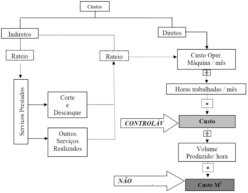 A classificação inicial dos custos em diretos e indiretos é assim efetuada: (1) custos indiretos em relação às atividades (centros de custos) e ao equipamento. Estes custos são apropriados em dois estágios: primeiro às atividades e, depois, aos equipamentos; (2) custos diretos em relação à atividade, mas indiretos em relação ao equipamento: também é necessária a utilização de bases de apropriação para que sejam alocados a eles. Mediante a divisão do custo total de operação do equipamento pelo total de horas trabalhadas no mês obtém-se o custo da hora/máquina. Entretanto, a base da receita cobrada é o m3 de madeira cortada e descascada. Assim, calcula-se o custo do m3, pela divisão dos custos da hora/máquina pela quantidade de m3 produzidos em uma hora de operação (Figura 5).